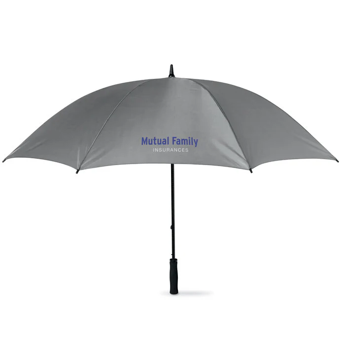 30 inch manual open windproof umbrella in 190T polyester with fiberglass shaft and ribs. Black plastic tips and top. Straight black EVA handle. Manual closure.