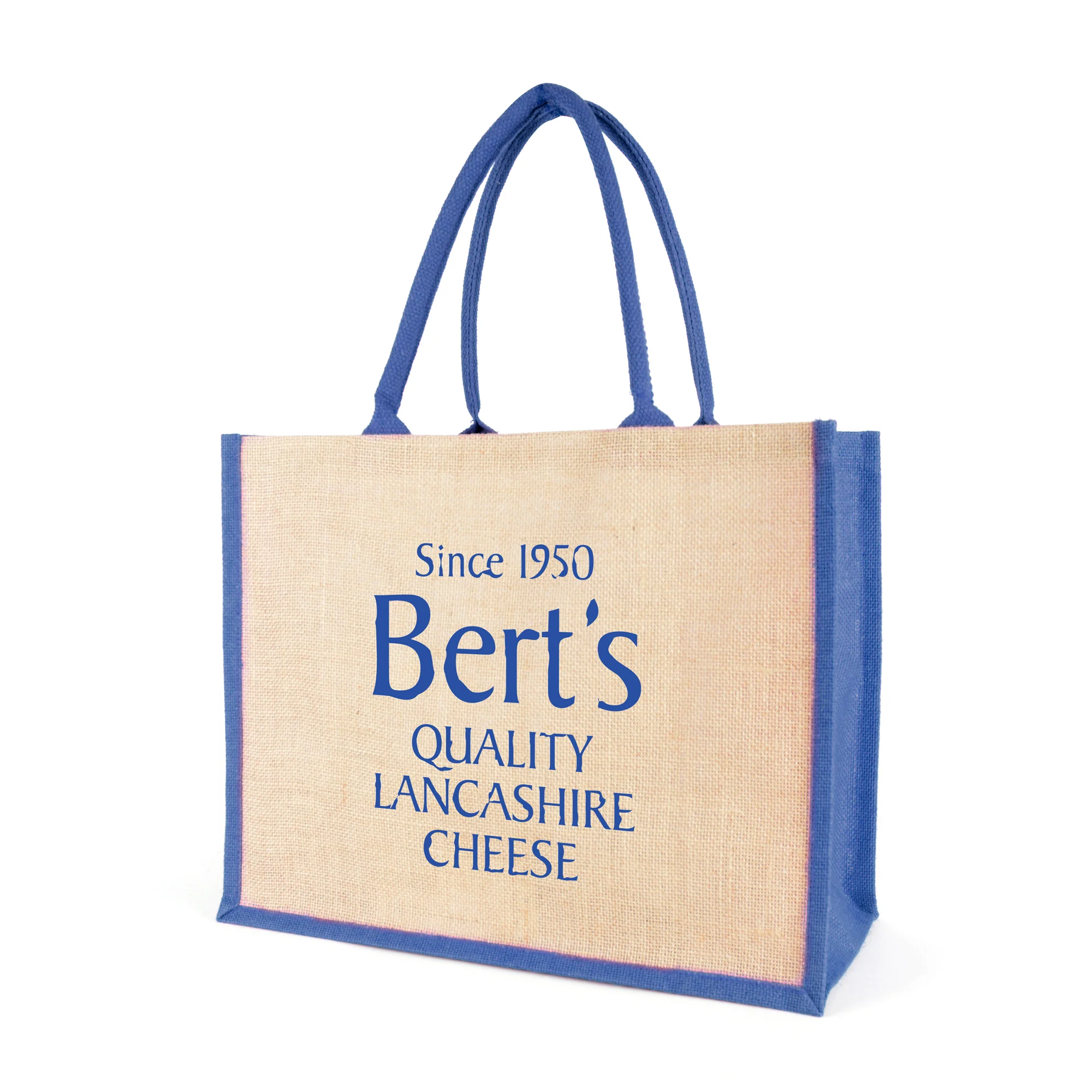 The classic jute bag; made from natural jute and in landscape profile. Features include rope handles, gusset, laminated backing and jute trim.