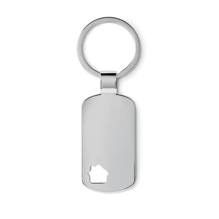 Metal key ring with house detail on the bottom. Individually packed in box.