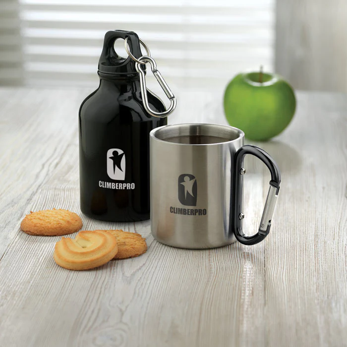 Double wall stainless steel mug, with carabiner handle. Capacity: 220 ml.