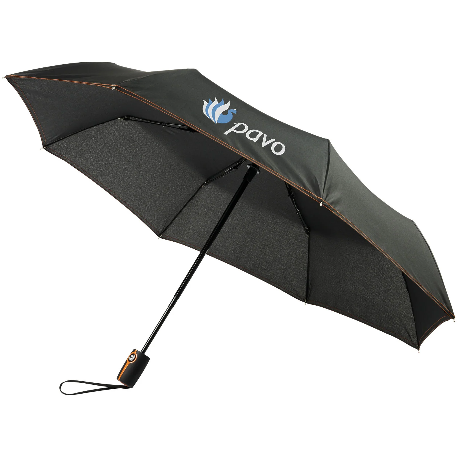 Automatic open and close foldable umbrella with a pongee polyester canopy. Sturdy metal shaft, a high quality frame with fibreglass ribs that offers maximum flexibility in windy conditions. Supplied with a pouch and can easily fit in a handbag or backpack for convenient carrying. Coloured details are available on the soft touch handle and detailed sewing on the canopy and pouch. Large decoration area on each of the panels, as well as the handle.